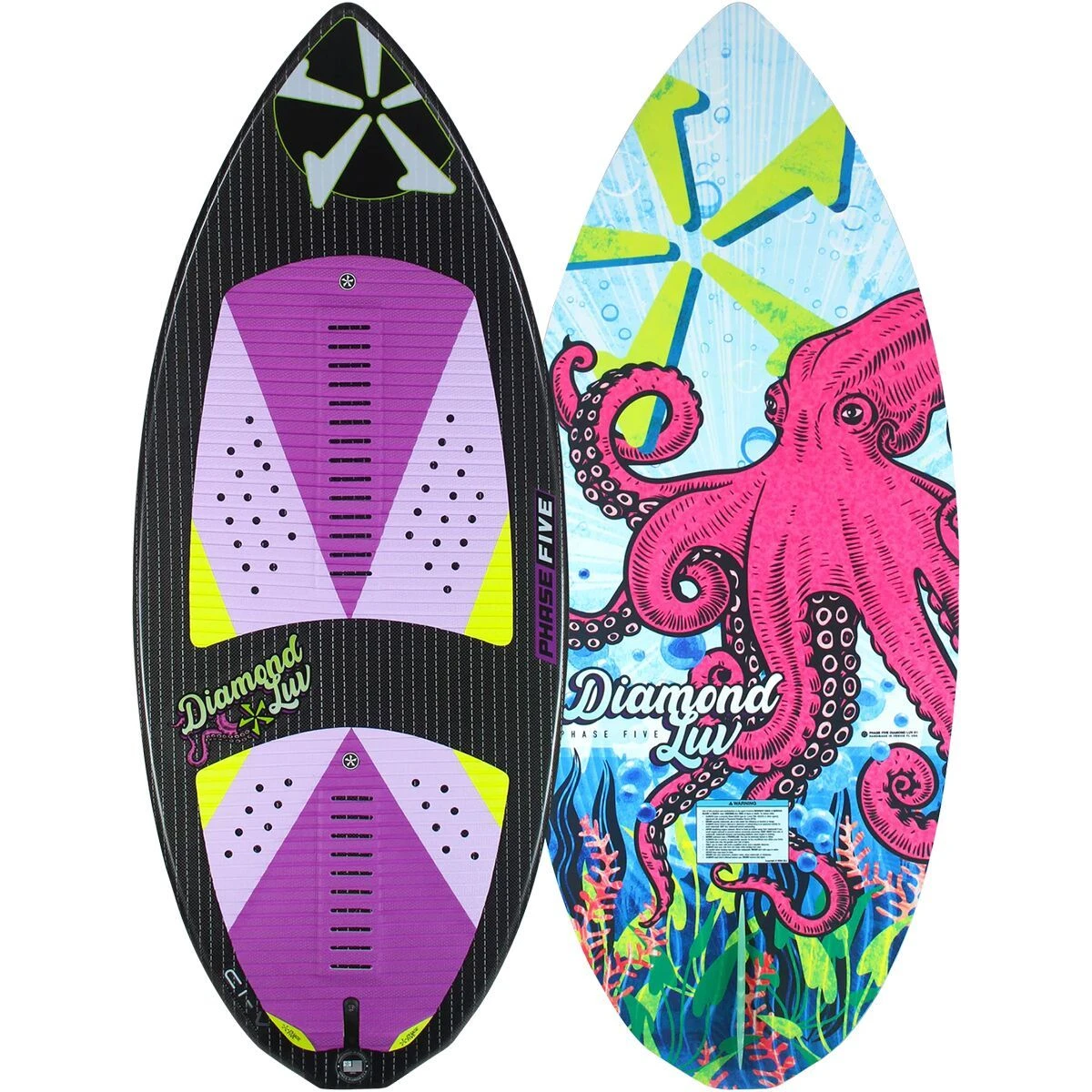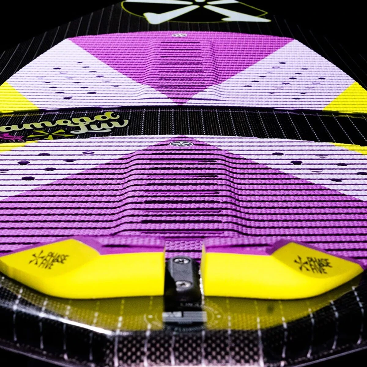 The carbon-fiber, pop-happy Phase 5 Diamond Luv Wakesurf Board is essential for skim-style surfers looking to push their limits behind the boat. This scaled-down version of the Diamond CL was built with women skimboarders in mind, but any intermediate-to-advanced rider that finds this smaller board fits their needs will be thrilled to have it in their quiver. The full diamond-shaped tail offers a stable speed to garner confidence and a wide platform to push and pop for boosting airs. The pointed nose is pulled in for greater float while carving and landing.