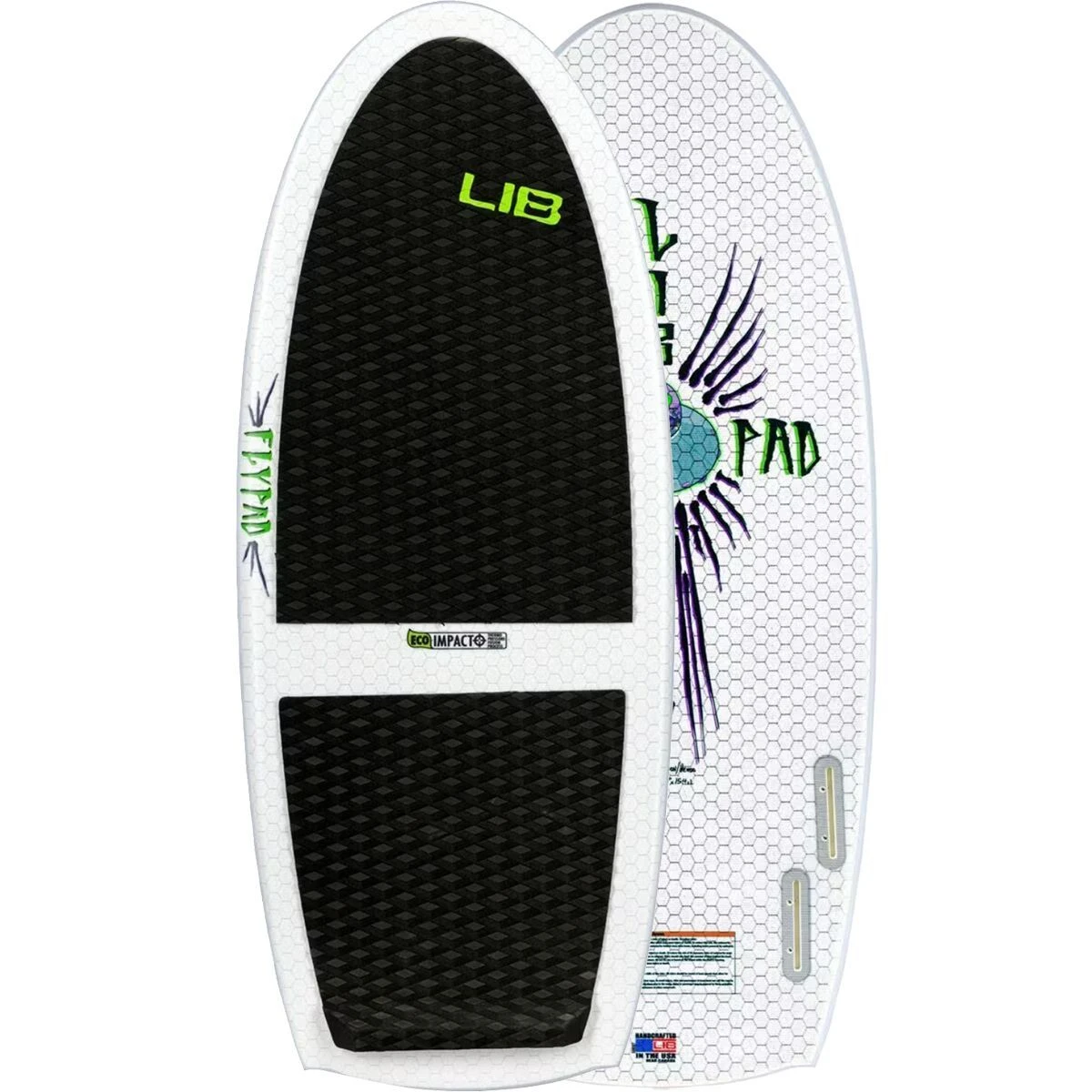 Introducing Mike Olsons new Fly Pad, a scaled down, teched up, ultra speedy, wake expanding, high performance, skateboard influenced wake surf shape. The game changing Fly Pad comes in three short, magical alien sizes: 310, 4 and 43 you ride it 6-8 shorter than your normal board. Mike is a big fellow and rides the 4 and has never been happier! There are so many features designed into this small fun enhancing dream stick it clogged our CAD programs… The plan shape features a narrow bullet like outline that is quick rail to rail, has a speedy straight rail line, and a wide fast tail with super pop. This is combined with a flatter rocker body and precision beveled nose that fits radically into small spaces. Mike added some critical details he dialed in through years of experiments… hard tucked rails that release water and create lift wrap the entire shape and he added two speed generating P.A.D. Particle Accelerator Dish concaves, one in the tail and one in the nose. The deck features a concave under the front foot to maximize the skateboard feel. Now you can fly with Mike on his space expanding, high speed explorations to the magical delicious nano center of wake surf design.